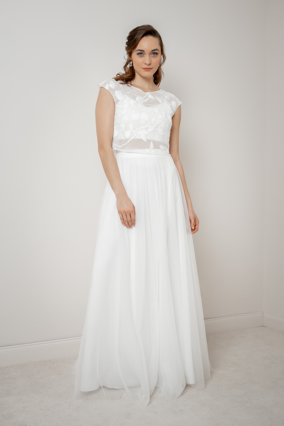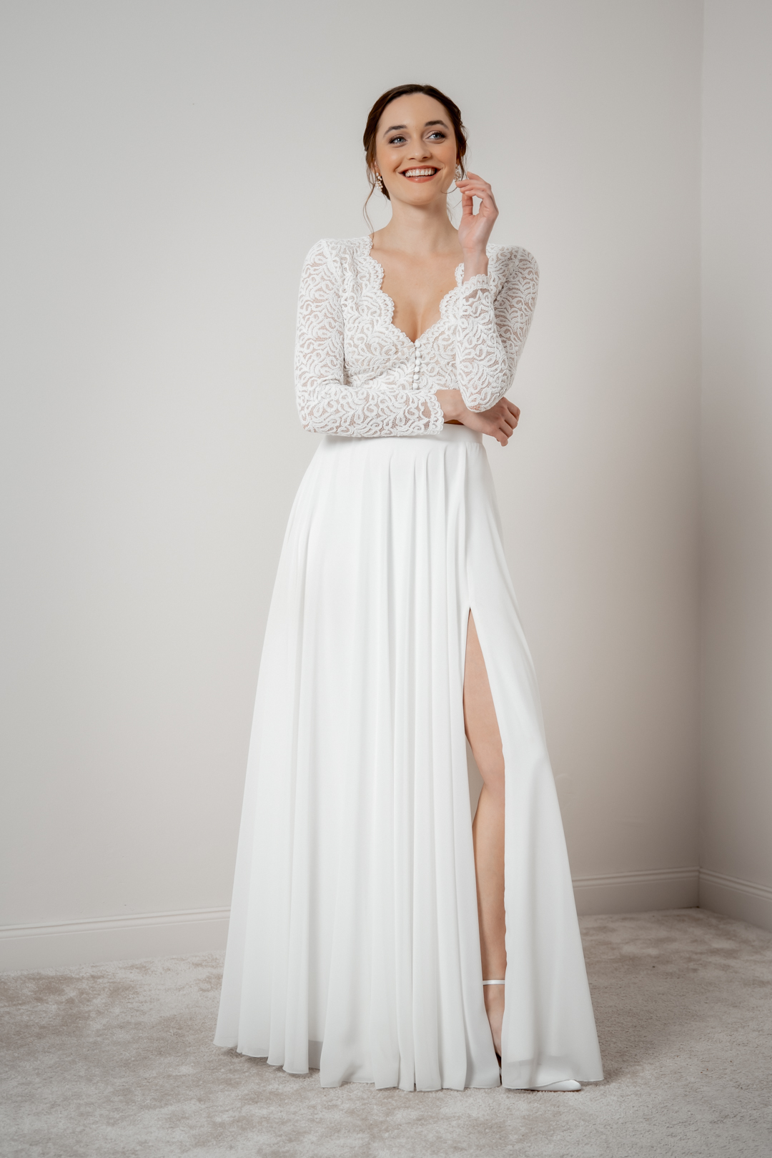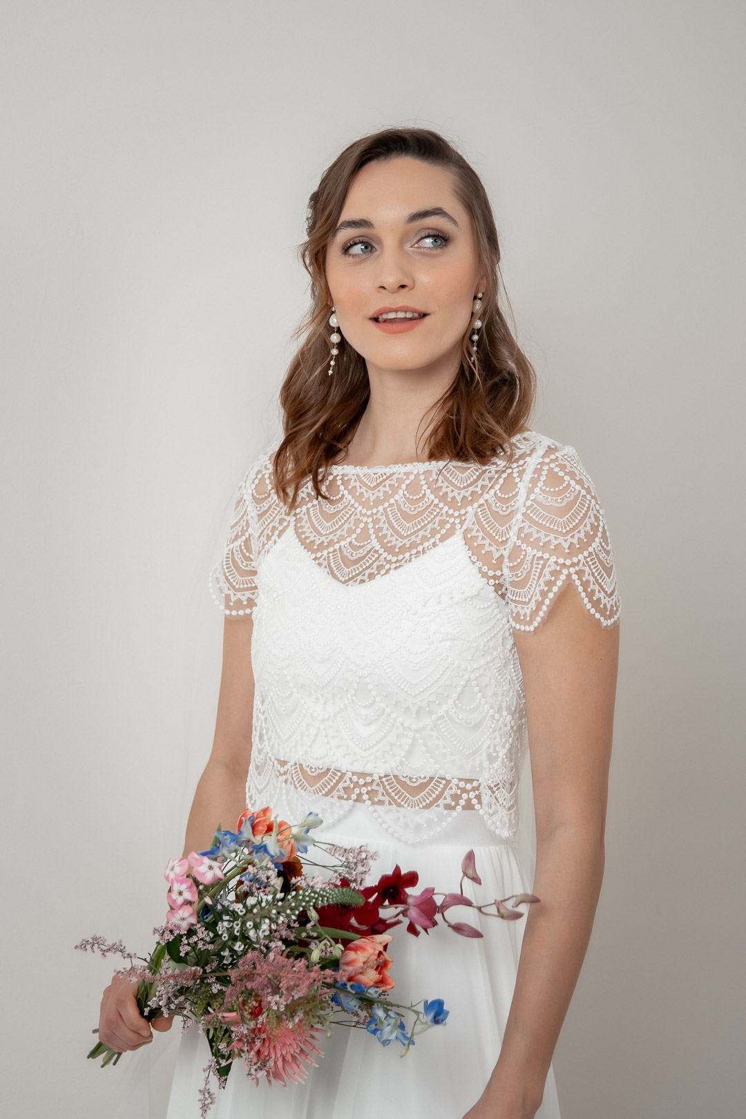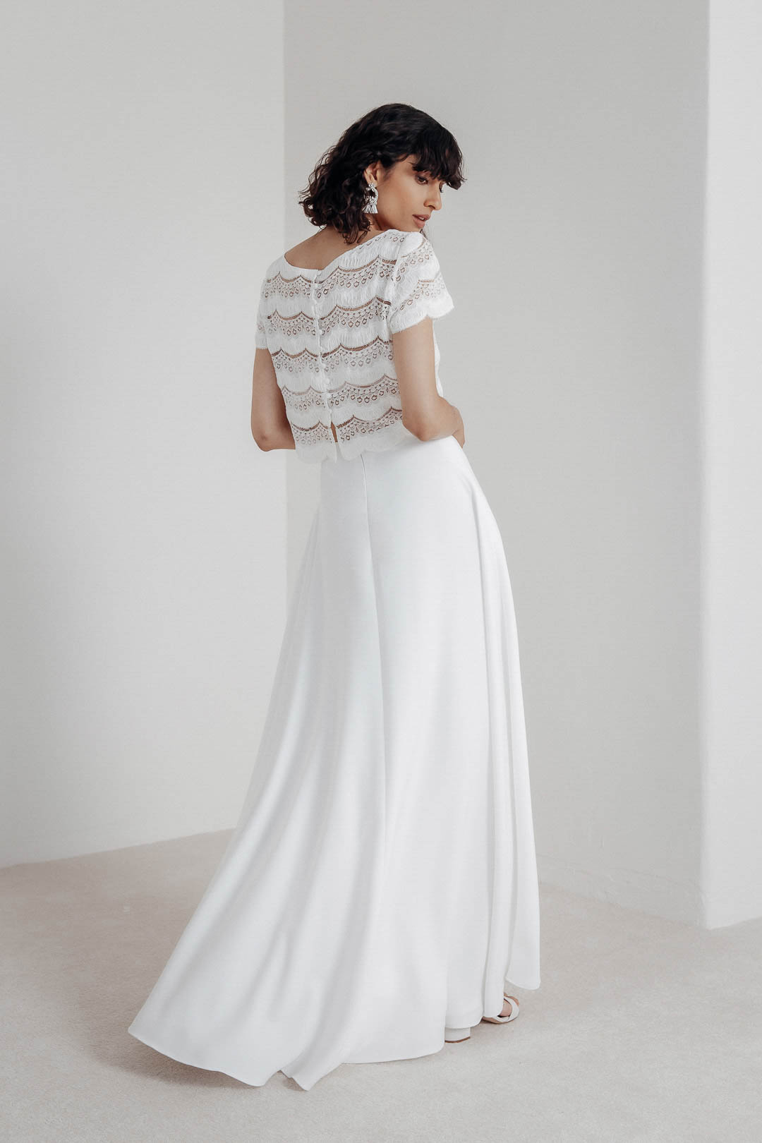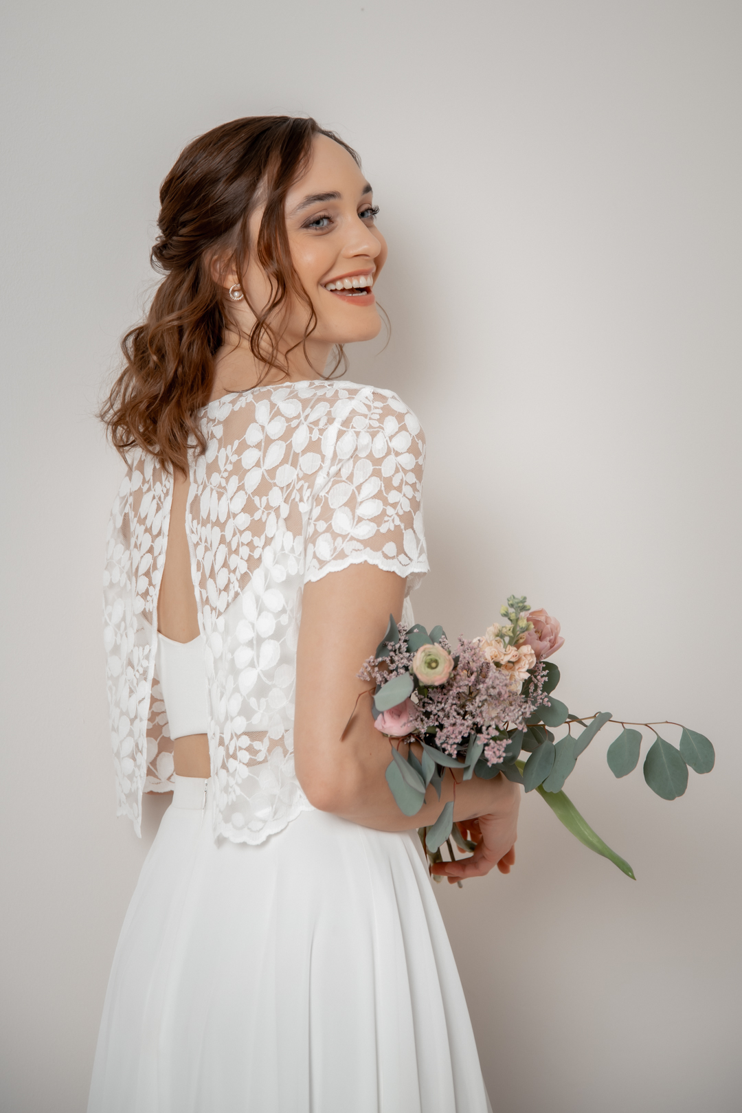 Der moderne Zweiteiler bietet dir durch das Mix&Match Prinzip große Freiheit. Kombiniere deinen Lieblingsrock oder eine Hose mit einem Top deiner Wahl. Dieses Konzept revolutioniert die Brautmode und ermöglicht eine nachhaltige Nutzung der Einzelteile auch nach der Hochzeit.