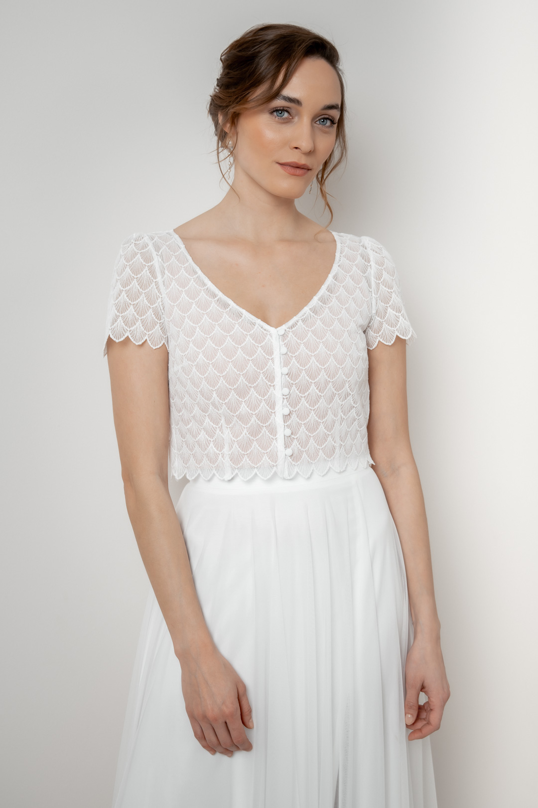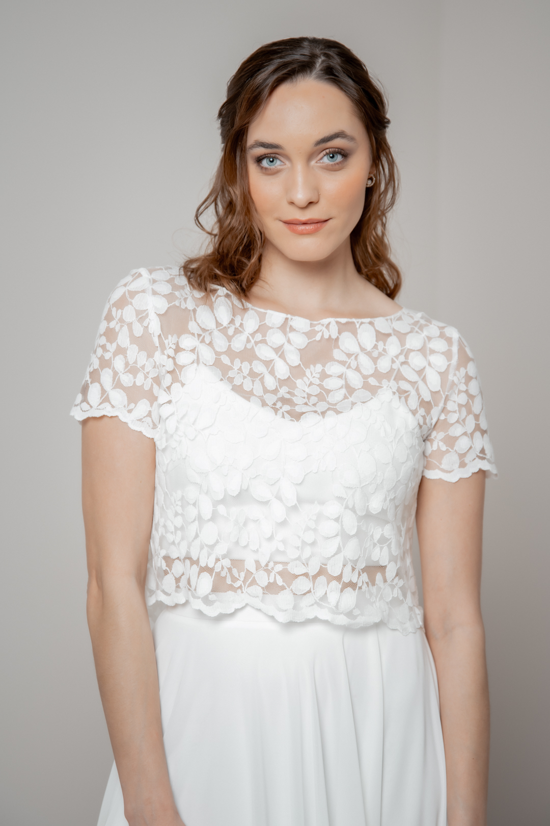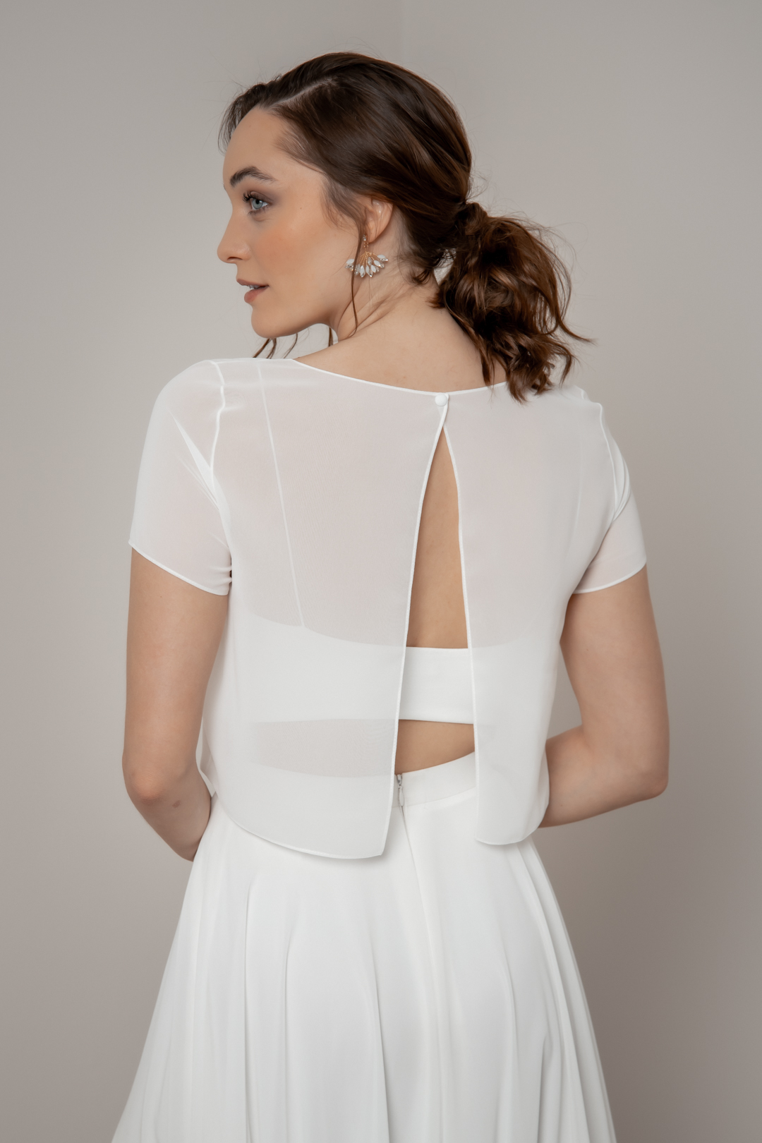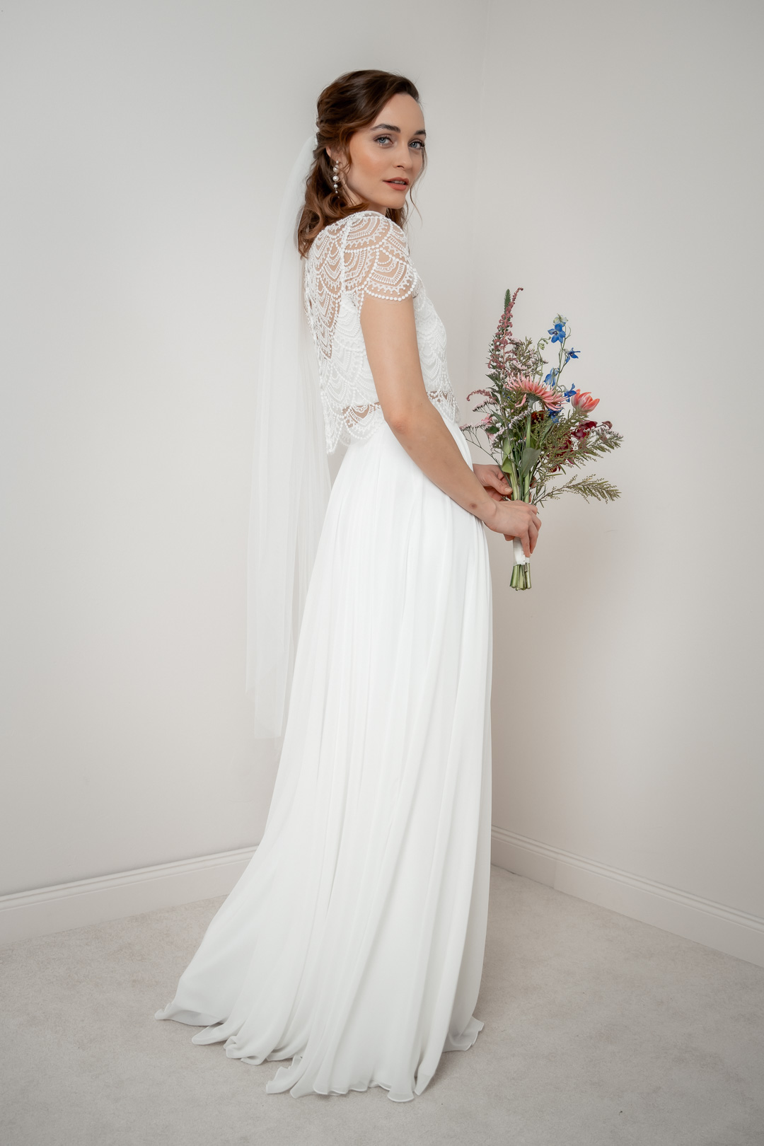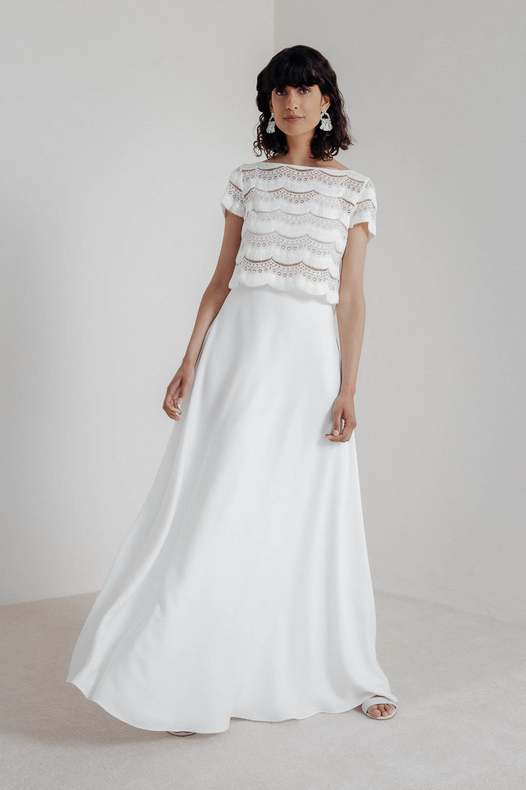 Der moderne Zweiteiler bietet dir durch das Mix&Match Prinzip große Freiheit. Kombiniere deinen Lieblingsrock oder eine Hose mit einem Top deiner Wahl. Dieses Konzept revolutioniert die Brautmode und ermöglicht eine nachhaltige Nutzung der Einzelteile auch nach der Hochzeit.